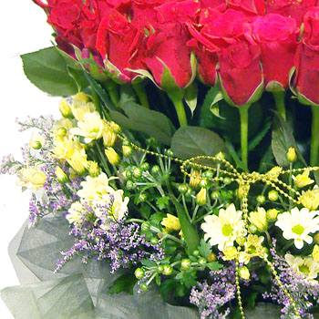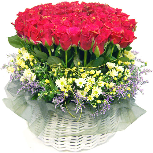 탐스러운 붉은장미와 아기자기한 소국의 조화가 돋보이는 꽃바구니입니다!